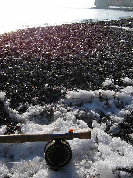 The scene for a macro photo of a winter fly. Has it all: snow, gear, fly, view and good light.